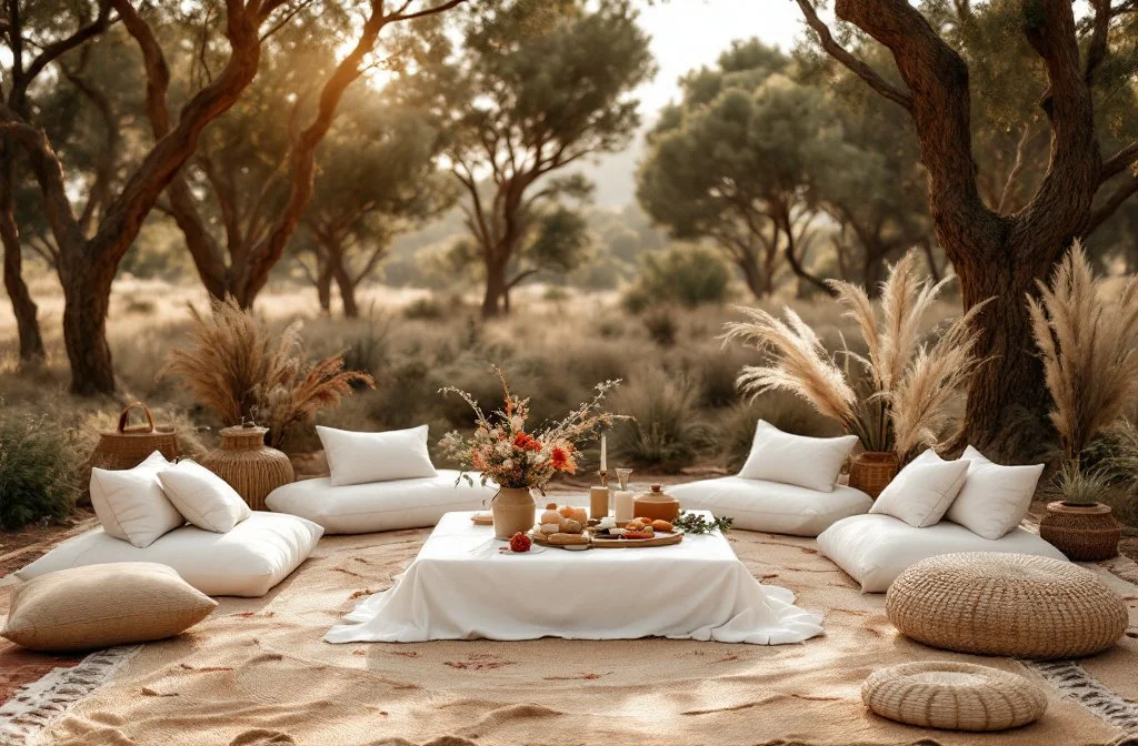 Drift into a cozy, carefree vibe with our Boho Dreams picnic where laid back style meets earthy charm. This setup features soft rugs, layered textures, and rustic, warm tones that create the perfect relaxed atmosphere. Think earthy colors, dried florals, woven accents, and a natural, free spirited aesthetic that feels both grounded and magical.